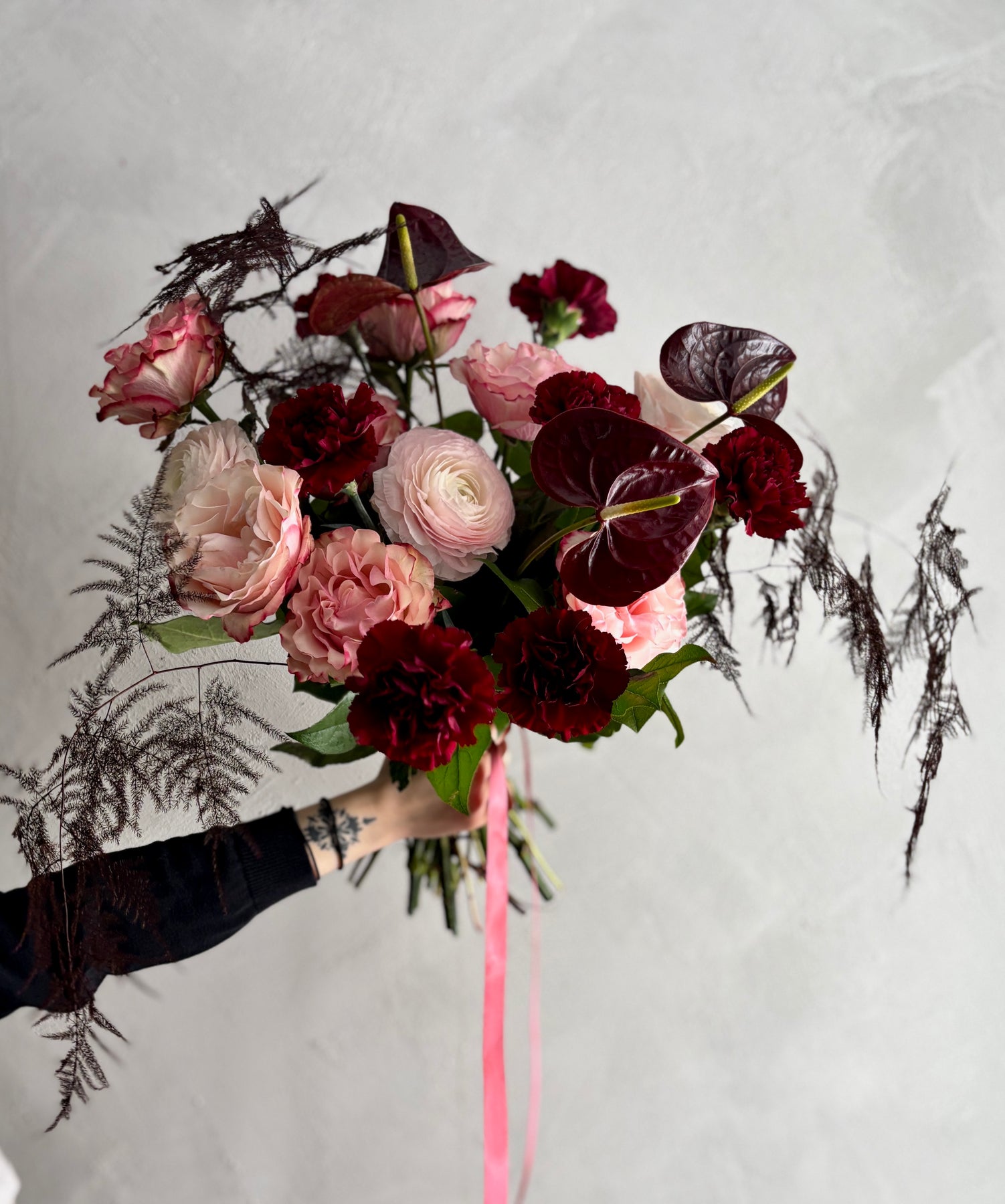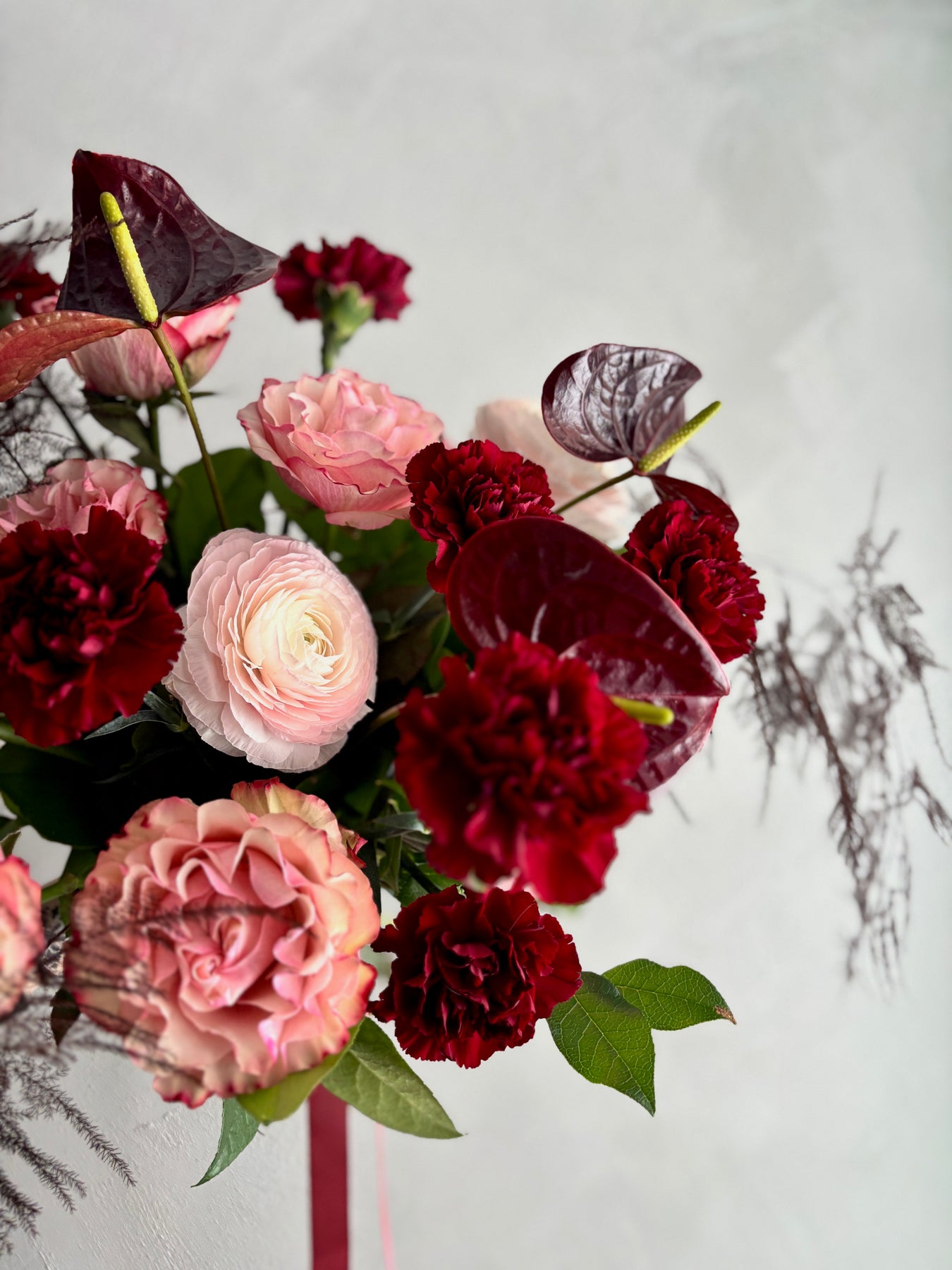 Bouquet aux teintes roses et rouges.